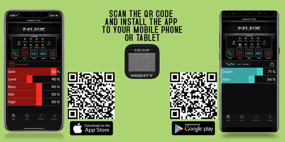 Możesz podłączyć swój telefon do MIGHTY 40BT przez Bluetooth i grać razem z ulubioną muzyką. Opracowaliśmy aplikację mobilną NUX Mighty do sterowania wzmacniaczem MIGHTY 40BT za pomocą smartfona. Możesz przełączać kanały wzmacniacza i kontrolować parametry wzmocnienia, poziomu i tonu – wybierz dowolny efekt i dostosuj parametry. Możesz kontrolować wszystko i odkrywać nowe funkcje dostępne tylko w aplikacji.