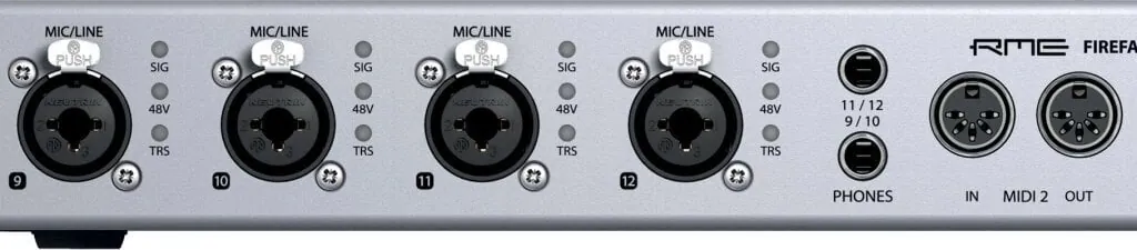 Tylny panel ujawnia pełne możliwości połączeniowe Fireface UFX III. Oprócz kolejnego wejścia/wyjścia MIDI dostępne są dwa optyczne wejścia/wyjścia ADAT, wejście/wyjście AES/EBU oraz osiem symetrycznych wyjść analogowych o poziomie liniowym (w tym stereofoniczne wyjścia monitorowe XLR). Dzięki nowemu trybowi Multi-Mode dwa wejścia/wyjścia ADAT mogą być wykorzystane jako oddzielne optyczne wejścia i wyjścia SPDIF (oprócz wejść/wyjść AES). Ponadto Fireface UFX III oferuje optyczny interfejs MADI (SC) z 64 dwukierunkowymi kanałami. Złącza Word Clock (BNC) pracują jako dodatkowe koncentryczne wejście i wyjście MADI, jeśli jest to wymagane.